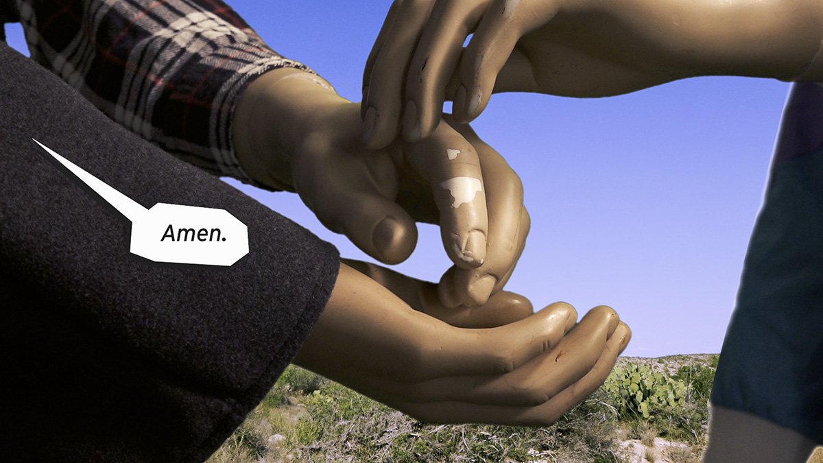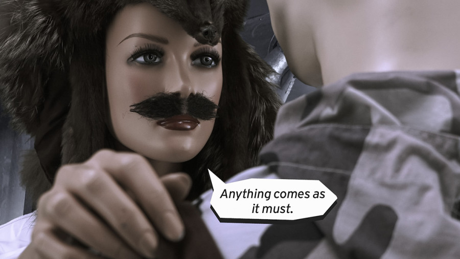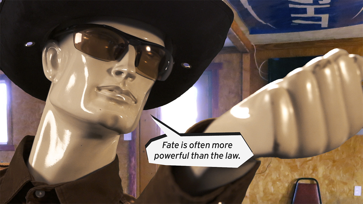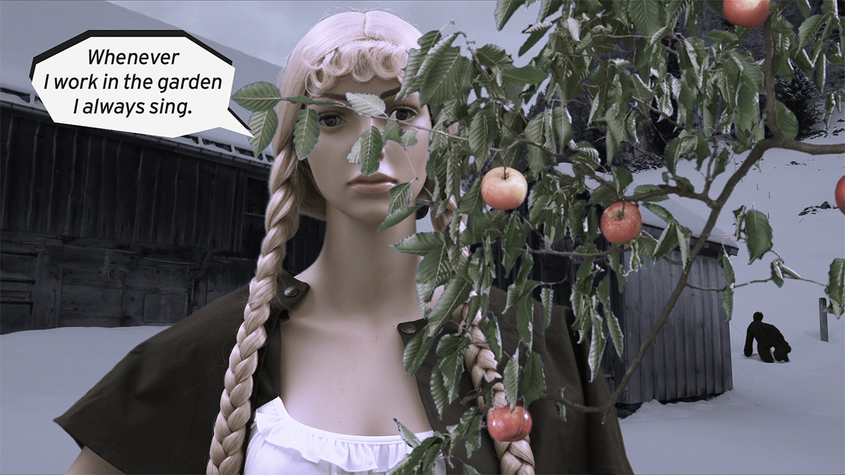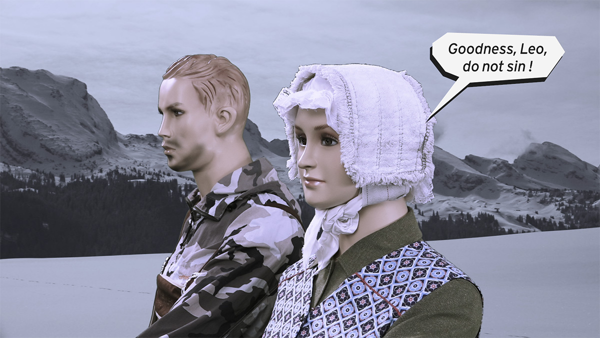 Die Akteure, Plastikmannequins mit menschlichen Physiognomien driften durch reale alpine Schneelandschaften und die Weiten öder Wüstengegenden. Sie lieben, reiten, saufen, tanzen, beten, philosophieren, schiessen Tiere - und sie schiessen gegeneinander.