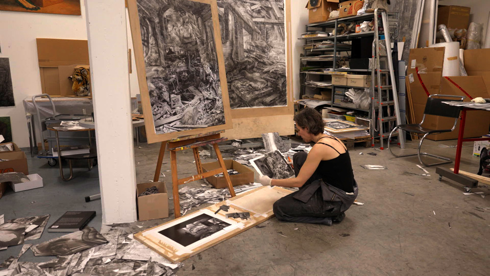 Die Langzeitbeobachtung zeigt die Künstlerin wie sie oszillierend zwischen den verschiedenen Medien wie Bleistift- und Wasserzeichnung, Malerei und Collage im Studio arbeitet. Für Hertig sind Bilder nicht etwas Abgeschlossenes, sondern jeweils Ausschnitte eines grösseren Wirklichkeitskomplexes. Hertig lässt die Zuschauer:innen an dieser Reflexion innerhalb ihres künstlerischen Prozesses teilhaben. Der Film trägt dazu bei, bestimmte gestalterische Aspekte des künstlerischen Prozesses hervorzuheben oder zu betonen und leistet einen Beitrag zur Gesamtdarstellung ihres Werks an der Grenze zwischen Zeichnung, Malerei und Collage. Es ist ein Denken mit Bildern über Bilder!