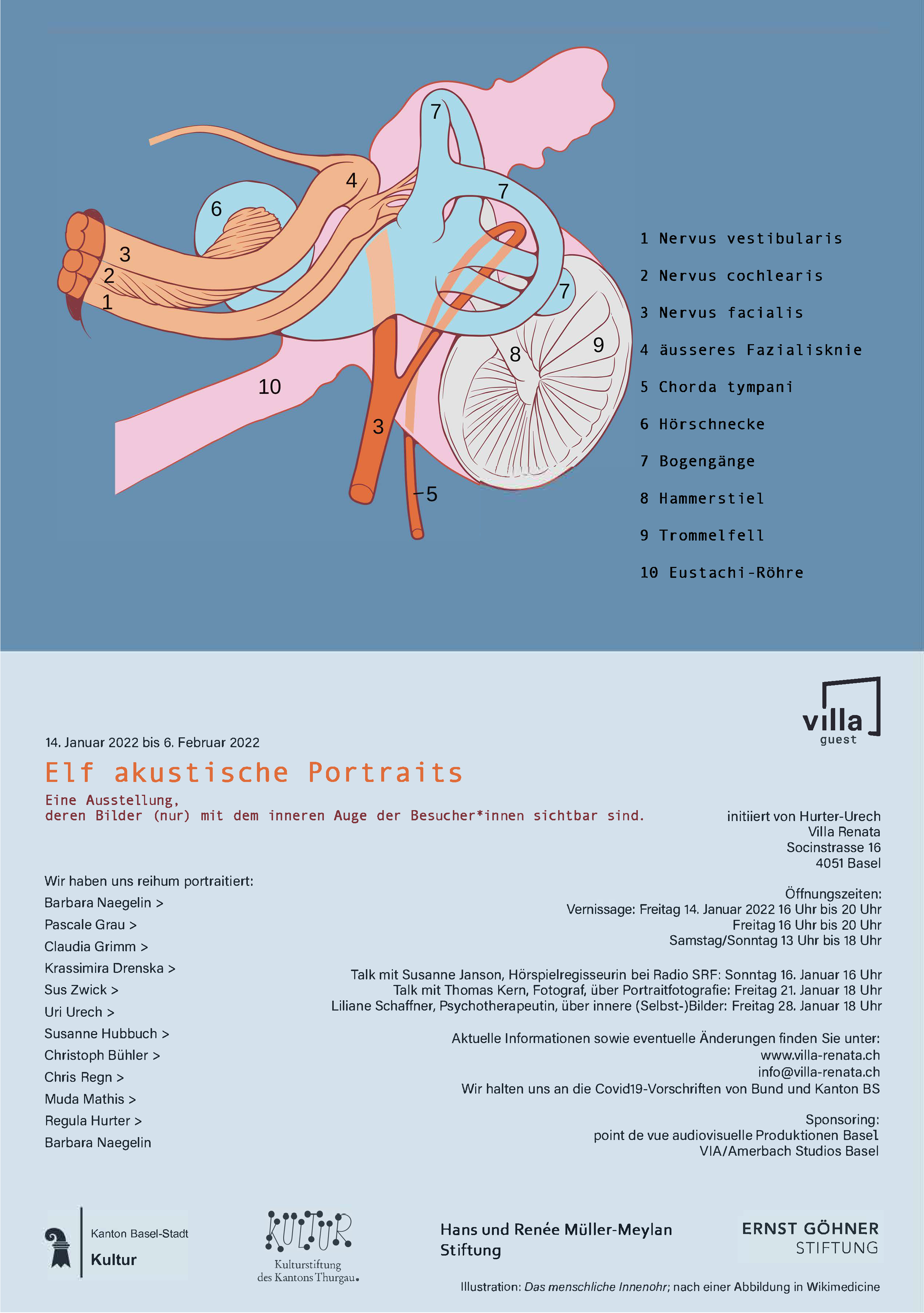 Alle 11 Beteiligten arbeiten, wenn auch einige nicht ausschliesslich, mit visuellen Medien. Trotzdem – oder genau deswegen – portraitieren wir uns nicht mit visuellen Mitteln, sondern ausschliesslich auf akustische Weise: mittels Stimmen, Klängen, Geräuschen, inszeniert oder dokumentarisch.