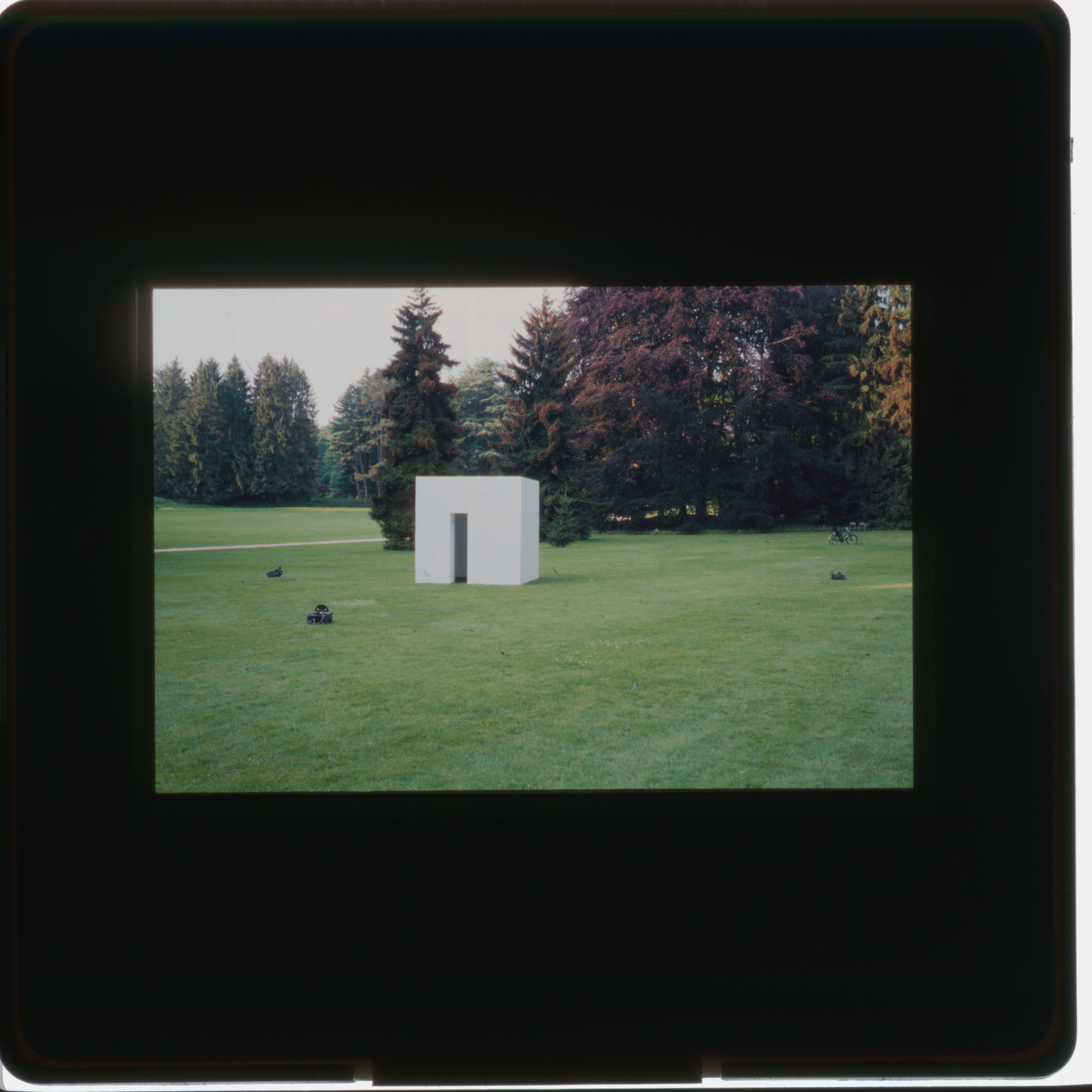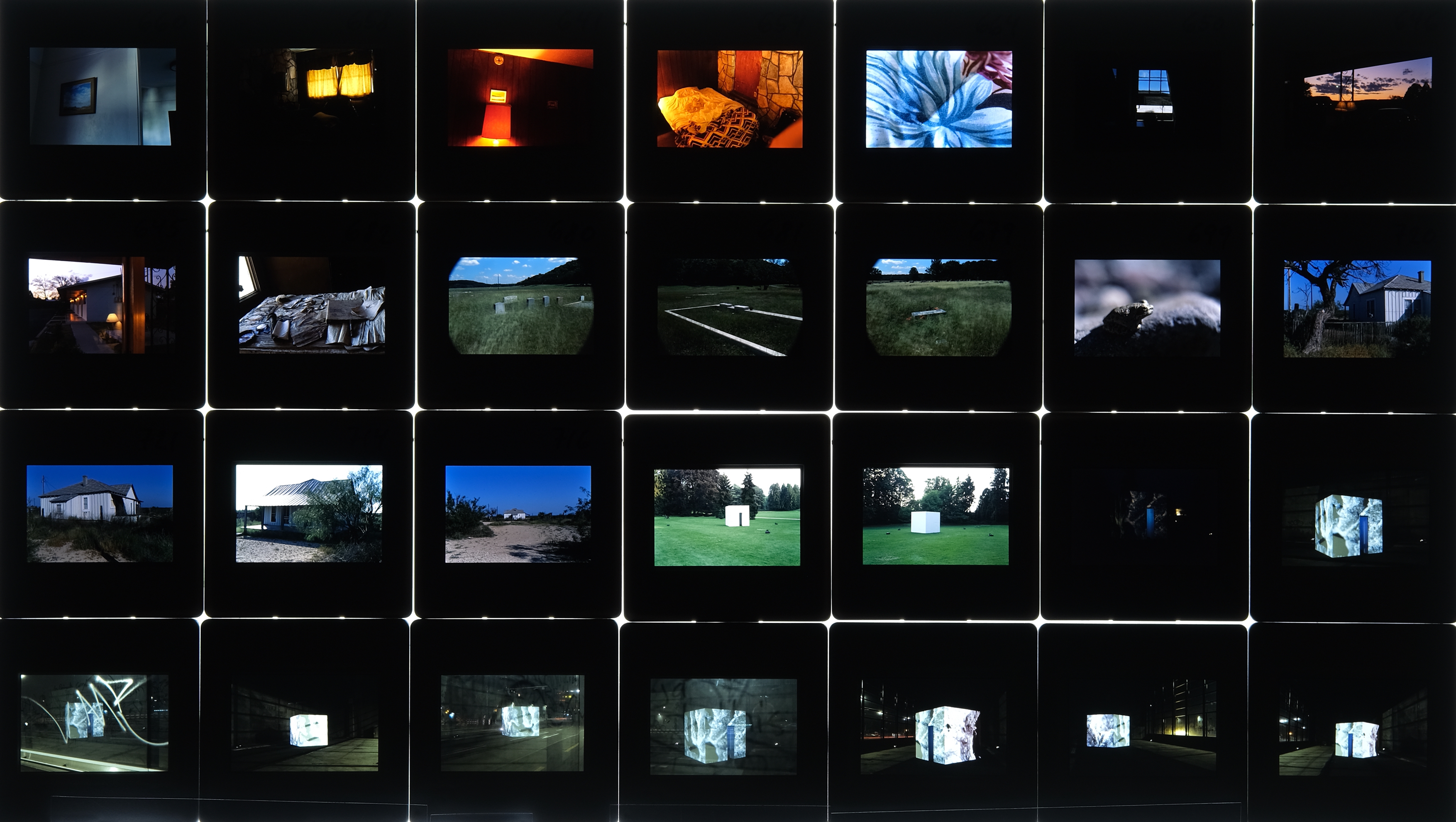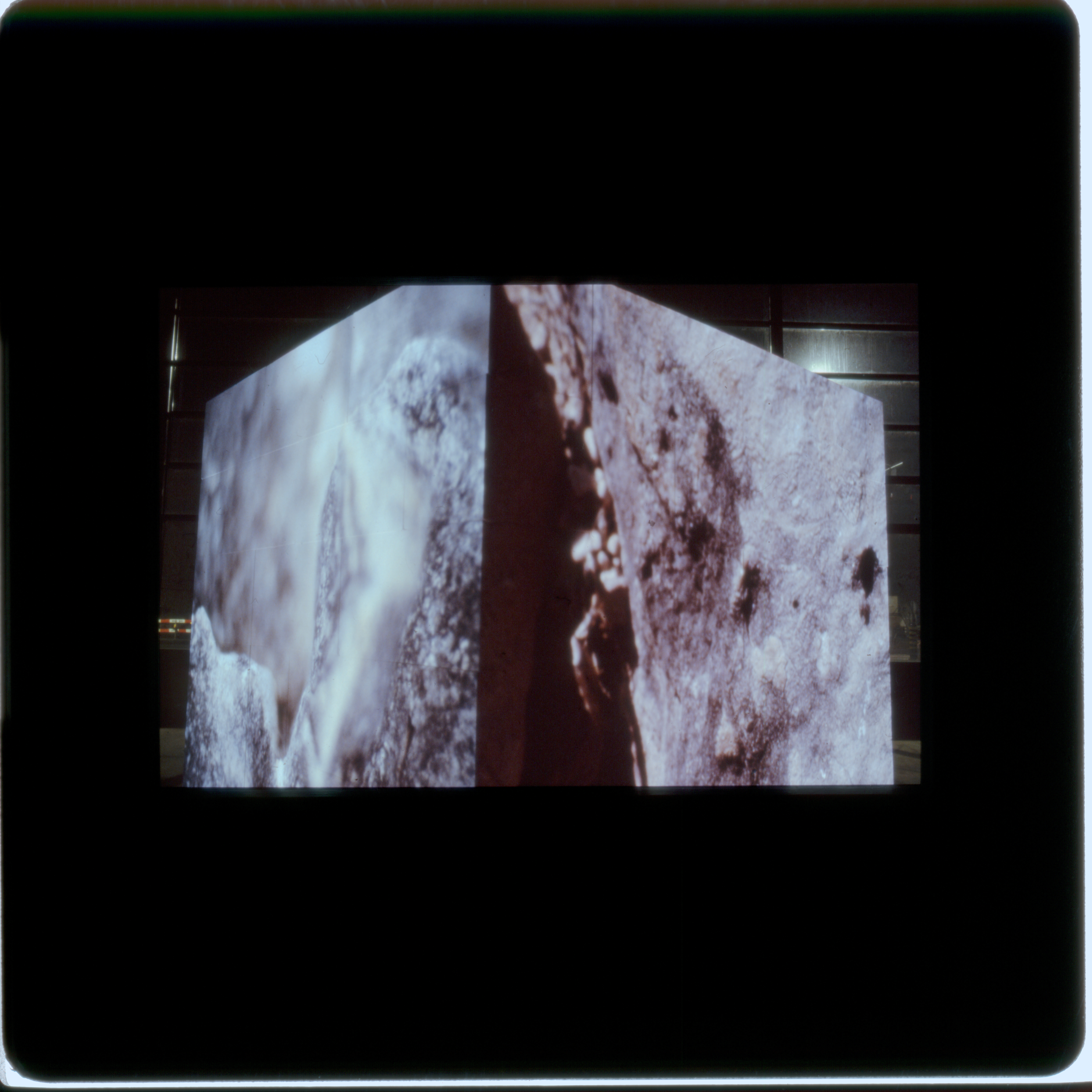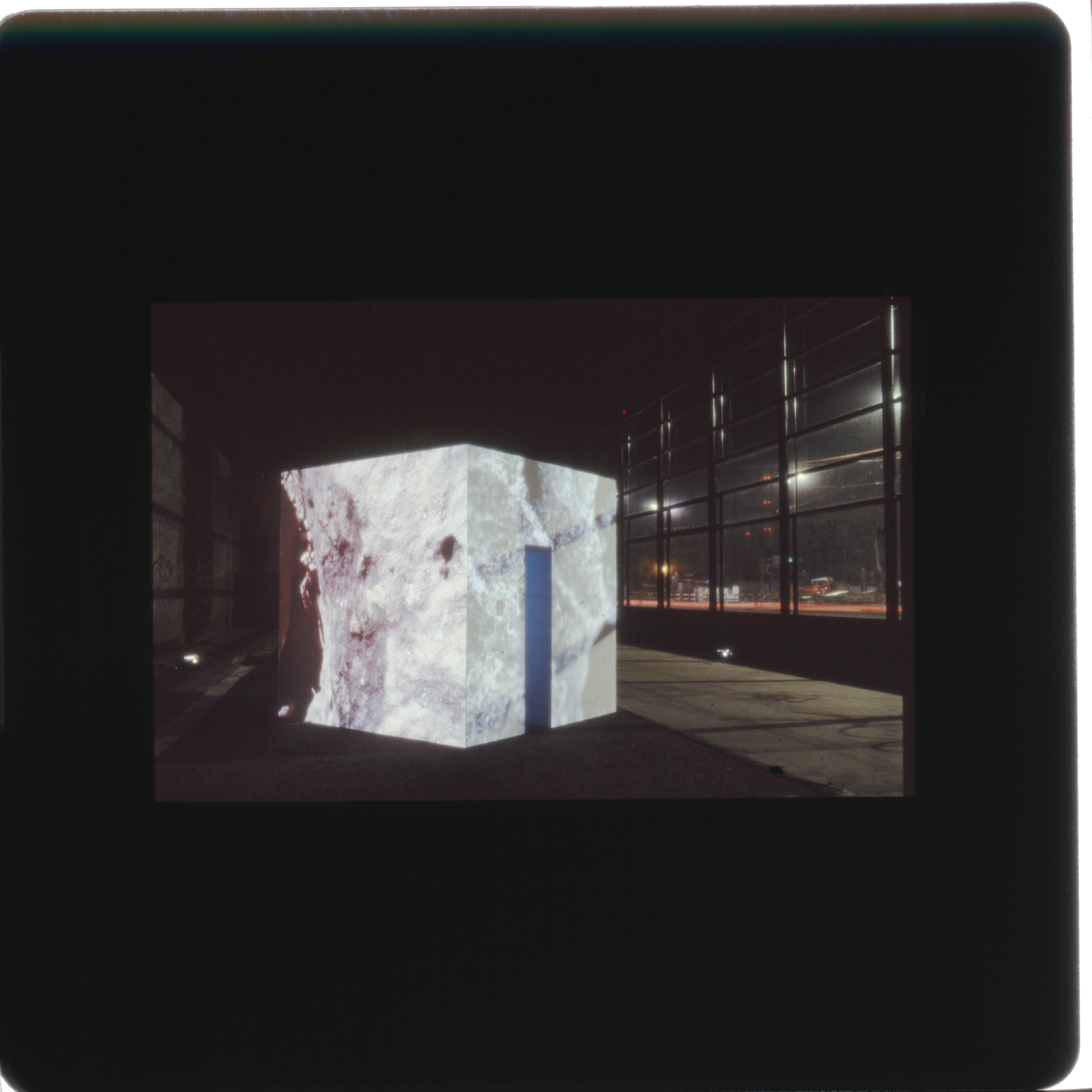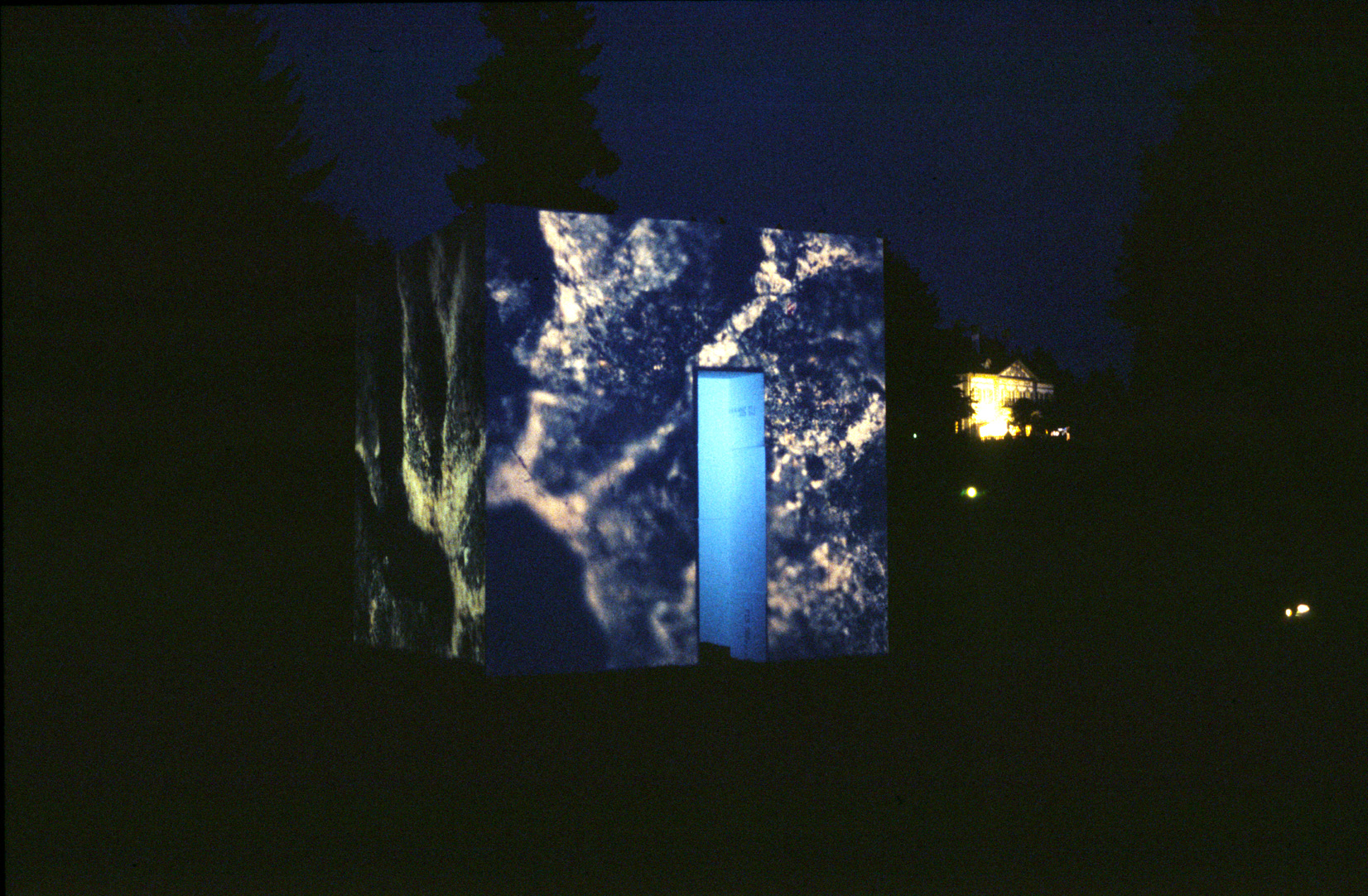 Vier mit je einem einzigen Dia bestückte Diaprojektoren, die die vier Aussenseiten des Kubus aufscheinen lassen.