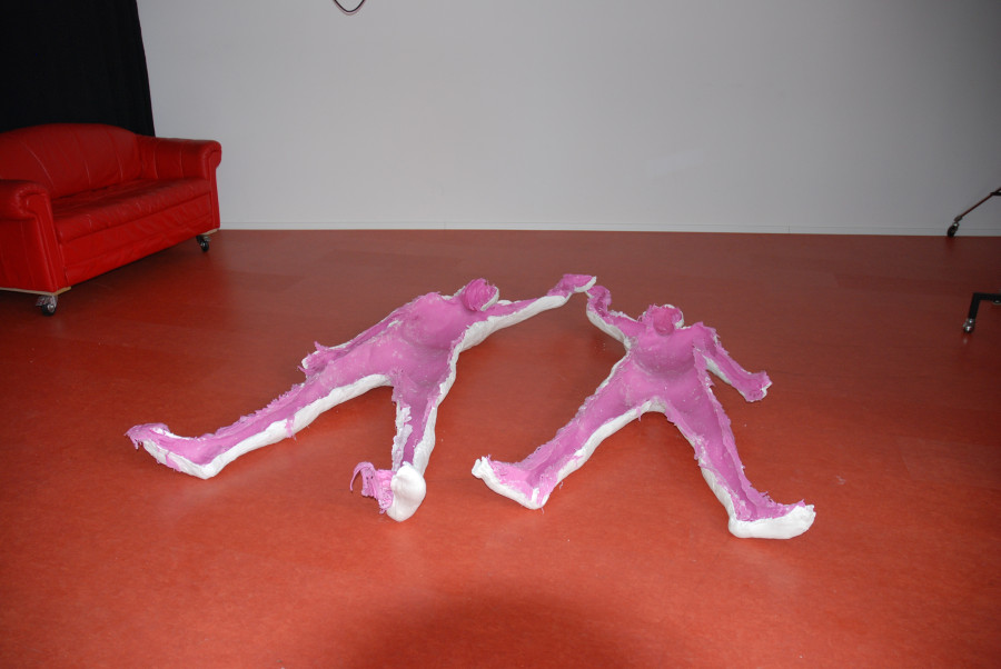 Eine Skulptur von Hurter-Urech. Ein lebensgrosser Abguss der Künstlerin und des Künstlers in Bonbonmasse.